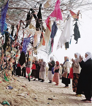 在新疆,尤其是在維吾爾族聚居的南疆,普遍存在類似內(nèi)地廟會式的麻扎朝拜活動。朝拜者面向麻扎傾訴心中的哀怨痛苦,以各種方式表達自己的祈求:有向麻扎求消災避禍的,有求富貴發(fā)財?shù)?,還有求夫妻和睦的,求理想伴侶的,求生兒育女的,求老有所養(yǎng)的,求天降甘霖的……