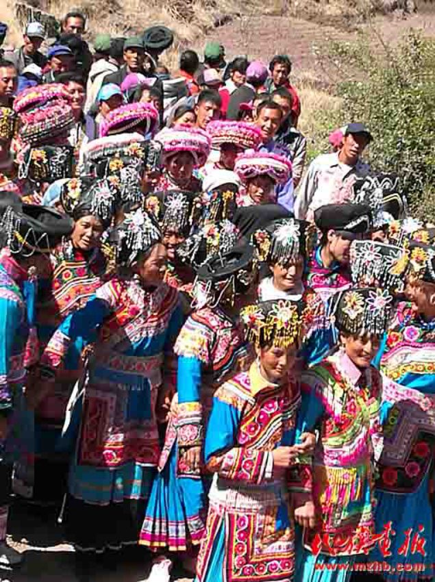 娶親要請(qǐng)客,當(dāng)?shù)乩圩逭?qǐng)客只需口頭傳話(huà),凡是知道的親戚朋友都會(huì)來(lái)參加。娶親隊(duì)伍主次兩位主婚人,伴郎伴娘各一人,背新娘和嫁妝的二人,接親的四至六人,其中有一至兩個(gè)歌手,一行十二人組成。帶著早已為新娘準(zhǔn)備好的花短衣、長(zhǎng)裙、銀手飾、圍腰鏈、銀泡、銀項(xiàng)等飾物興高采烈地從新郎家出發(fā)。