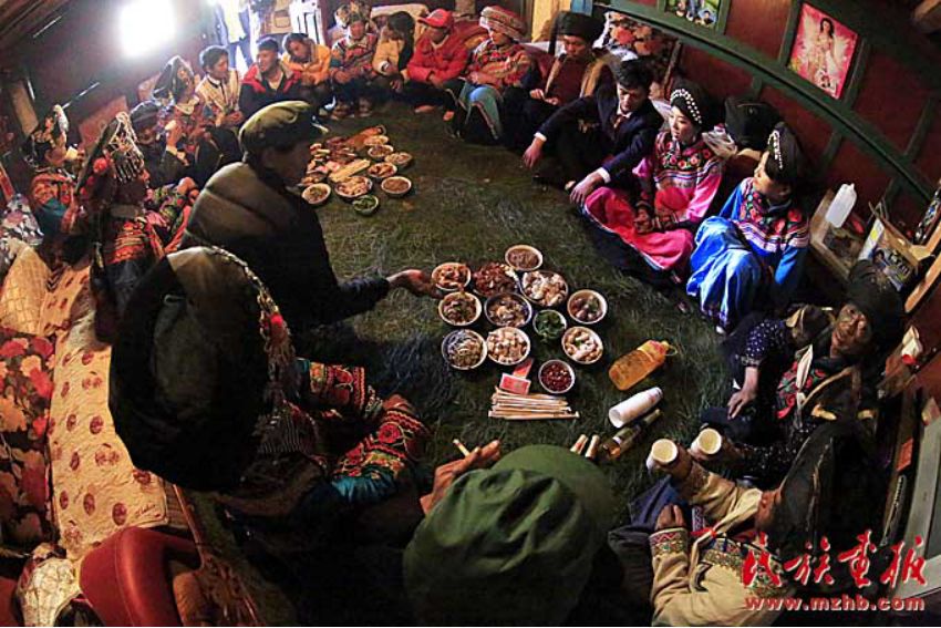 宴席一般不用桌子,酒菜擺在青棚下面鋪好青松毛的地上