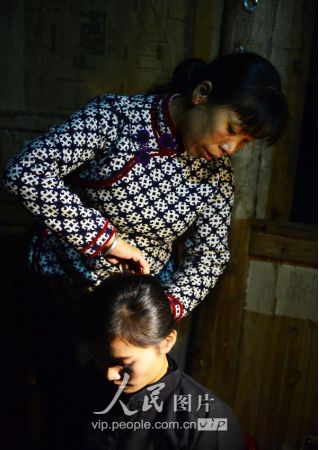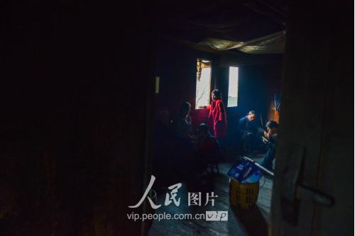 一般要到快過(guò)春節(jié)的時(shí)候,男方家才專門請(qǐng)人去接女方來(lái)洗糯米、打糍粑,新娘方能在夫家住上一夜;在來(lái)年農(nóng)忙時(shí)節(jié),又接女方來(lái)幫忙,夜里仍不能在男方家留宿,幫完忙當(dāng)晚即回去,只有待到女方有身孕后,新娘才到夫家長(zhǎng)住。圖為11月16日夜,新娘潘芝銀家為準(zhǔn)備婚禮,燈火徹夜長(zhǎng)明。