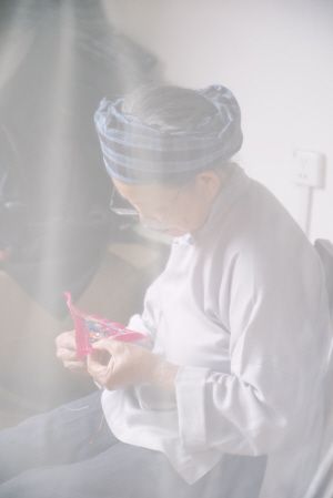 對制衣人來說,她們?nèi)缗e行儀式般專注著染布、成衣,或許也在這個過程中積攢起許多專注和深情。一位有十幾年經(jīng)驗的阿姐曾告訴我:“做這衣服要有一顆溫柔的心。”聽時深深一顫,而用黃奶奶樸素的話,則是“染布高興”。
