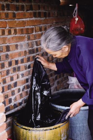 “染好后,顏色會掉嗎?”由于過往體驗,我對藍染的穩(wěn)定性存有懷疑?!昂玫暮诓?,要反復染一個多月,做出來的衣服再洗就不容易掉色??赡荛_始掉一點點,洗兩三次后就不掉了?!秉S奶奶篤定地回答。