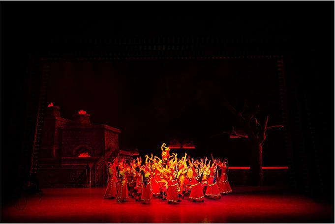 在手段創(chuàng)新上,主創(chuàng)人員在嚴(yán)格遵循南木特藏戲藝術(shù)傳統(tǒng)和戲劇原則的基礎(chǔ)上,設(shè)計了部分新的唱腔,使用了現(xiàn)代舞臺的舞美和聲光電手段,采用了26人組成的中型民族樂隊,從而營造出了全新的舞臺效果。在藝術(shù)手法上,還采用了以南木特藏戲手段表現(xiàn)西藏藏戲內(nèi)容的特殊表現(xiàn)形式,以戲中戲的重疊盡顯不同風(fēng)格的藏戲風(fēng)采,大大地豐富了表演手段和出彩看點,為觀眾提供了巨大的想象空間。