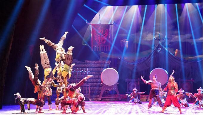 雜技是這部劇的一大亮點(diǎn)。新疆生產(chǎn)建設(shè)兵團(tuán)雜技團(tuán)近年來(lái)編創(chuàng)了《天鵝湖—男子倒立技巧》《向太陽(yáng)—繩技》《春之韻—女子造型》等多個(gè)精品節(jié)目,并在國(guó)內(nèi)外重大雜技賽場(chǎng)多次獲獎(jiǎng)。《樓蘭尋夢(mèng)》中,主創(chuàng)團(tuán)隊(duì)將這些獲獎(jiǎng)節(jié)目進(jìn)行拆解,將蹬鼓、獨(dú)輪車、吊環(huán)、肩上芭蕾、水流星及舞中幡等雜技技巧與戲劇元素相融合,讓觀眾猶如置身于黃沙漫漫的絲路古國(guó)。