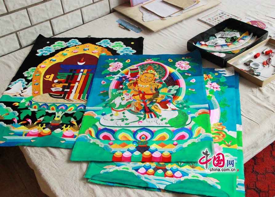 堆繡的工序一般有圖案設計、剪裁、堆貼、繡制,個別圖案部分上色等。堆繡先按規(guī)范的佛畫繪成畫稿,再按佛像不同部位的要求選用各色面料,剪貼縫制而成。小幅畫面為一尊主佛像與下方兩尊小佛像組成,周圍配以花卉、云紋、日月、供品等圖案。與傳統(tǒng)的唐卡不同,堆繡工藝品是用各色棉布、綢、緞剪成所設計的各種圖案形狀,精心堆貼成一個完整的畫面。其工序有圖案設計、剪裁、堆貼及個別圖案部分上色等。一般來講,圖案設計環(huán)節(jié)主要以客人需求為主。勾草圖最能考量藝人繪畫技能,也是至關重要的步驟。圖案設計完成后,將各色布料比照圖案剪裁、粘好,之后再填充以羊毛或棉花等,以使圖案凸起,最后將各色布料圖案堆貼在設計好的大幅布幔上,構成一組完整的畫面,達到靜中有動、生動傳神、惟妙惟肖的境地。使畫面產(chǎn)生豐富生動的立體感和織物特有的肌理感,達到淺浮雕式的藝術效果,表現(xiàn)力豐富。作品粗獷中顯細膩,點滴中見絕妙,技藝精湛,巧奪天工。一幅堆繡可以說是一幅絲質的彩色浮雕作品,極具藝術觀賞價值。