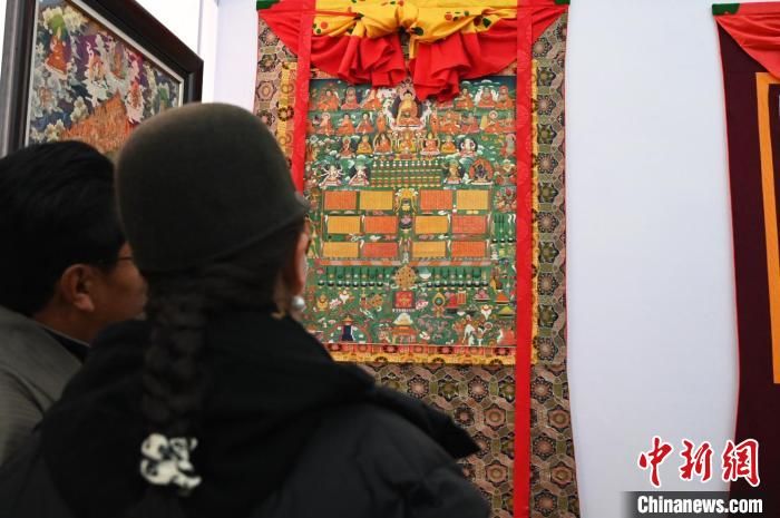 圖為唐卡愛(ài)好者欣賞唐卡展品。 趙朗 攝
