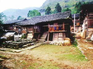 筆者看到的干欄式木樓和吊腳樓在使用的功能上相差無(wú)幾,上層住人待客,樓下四壁用木板圍擋,圈養(yǎng)畜禽,存放燒柴、農(nóng)具和秋收臨時(shí)堆放的糧食。豬圈靠里側(cè)依柱圍欄,其它空閑的地方打掃得干干凈凈,有的將織布機(jī)放在樓下明亮的地方。住房一般5間,兩頭兩間是偏廈,中間3間是寬敞的堂屋,一頭設(shè)火塘、土灶,為烤火、煮飯之處;另一頭的中柱供臨時(shí)設(shè)席敬神之用,也有的在板墻上設(shè)佛龕神位,供奉祖先;臥室依房柱用木板靈活隔間。大門有的開(kāi)在房山墻一側(cè),也有開(kāi)在中間的,皆登石階、板梯而上。吊腳樓一棟挨著一棟,小巷道曲折狹窄,只容牽牛和順向挑擔(dān)通過(guò)。