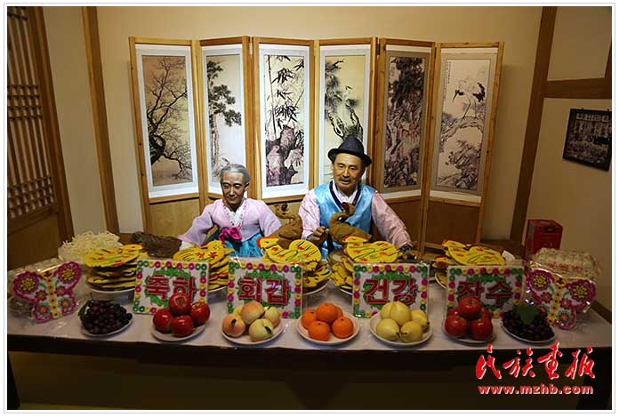 朝鮮族人民非常注重禮節(jié),尤其崇尚尊老愛幼的傳統(tǒng)美德。步入廳堂,回婚禮(為紀(jì)念結(jié)婚60周年而舉行的賀禮)中,新郎新娘的蠟像引得大家駐足觀看,新郎的衣著形似明朝時期的官服,頭戴官帽,據(jù)說“新郎官”的稱謂就由此而來。隆重的回婚禮教育人們忠于愛情,也是儒家思想中“修身齊家治國平天下”中的“齊家”思想的延續(xù)。走進(jìn)另一廳堂,朝鮮族的花甲禮,六十為一甲子,花甲之意來源于此。花甲禮是朝鮮族家庭為60歲老人舉行的大型生日宴。在擺滿各種花色的食品的“大席”前,兩位老人面南端坐,接受兒孫、親朋好友的跪拜與祝福。