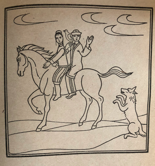 汗想坐得靠近那個(gè)美女一點(diǎn)兒,可是,他剛往前一湊,美女一下子變成了狼,上去把汗抓了個(gè)頭破血流,然后很快地跑掉了。狼又從后面趕上了少年和那位姑娘。少年又對狼說:“我也不想跟這匹馬分開了,能不能想個(gè)辦法呢?”狼說:“可以。”在回到第一個(gè)汗的附近時(shí),狼又搖身一變,變成了一匹駿馬。少年?duì)恐E馬送到汗那里。汗回謝以后,就給了他那只金絲鳥。少年帶著金絲鳥和姑娘一起騎上馬又走了。