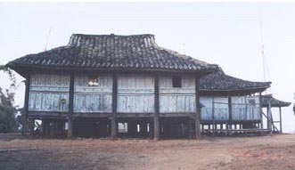 比較典型而普遍的是以德宏地區(qū)一戶一院式的正方形冠蓋式竹樓。構(gòu)架為穿斗式木梁柱,樓面、隔間均用竹片或木板鋪設(shè)。這種竹樓分主樓和附房兩部分。上下兩層,有主副兩座樓梯。主樓呈正方形,樓上住人,分為臥室和客廳,供全家人起居、會客和存放糧食、雜物之用;樓下圈養(yǎng)牲畜。附房多建在主樓的一側(cè),用作堆放柴草及安置舂米的腳碓。