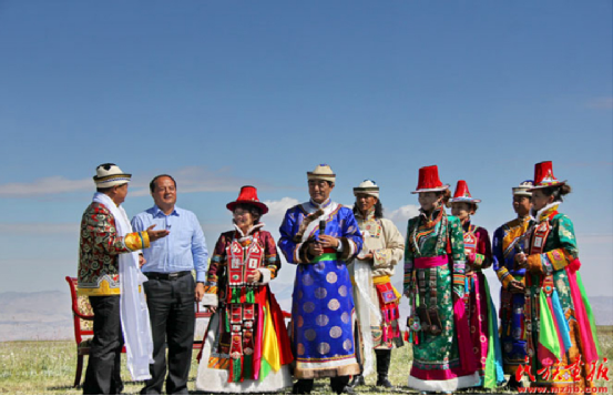 CCTV7《鄉(xiāng)約》欄目錄制現(xiàn)場(chǎng)。向全國(guó)觀眾介紹肅南縣及裕固族文化。央金攝 引自民族畫(huà)報(bào)