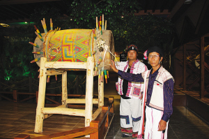 基諾大鼓被基諾族人視為本民族的“根譜”。圖為白臘先(右)在基諾族博物館中輕撫基諾大鼓。