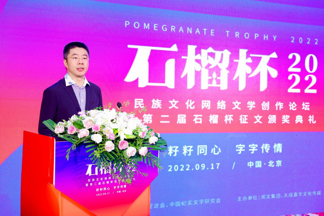 2022年9月17日,民族文化網(wǎng)絡文學創(chuàng)作論壇暨第二屆石榴杯征文頒獎活動在民族文化宮舉行。本次活動得到了國家民委所屬中國少數(shù)民族文化藝術促進會和中國紀實文學研究會的指導與支持,由閱文集團、北京天成嘉華文化傳媒主辦,天成達星國際傳媒承辦。