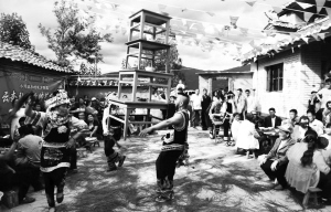 輪到阿文光跳抬菜舞了,只見他穿一件繡滿山茶花的彝族火草領(lǐng)褂,亮晃晃的光頭,微微挺起的肚子敞露著,嘴叼一張八仙桌,桌上擺了“八大碗”。他右手三指托盤,左手搭塊新毛巾,面帶笑容,摔手踢腳,搖頭晃腦,似醉非醉,動作十分驚險,真讓人擔(dān)心一桌子菜會掉下來。旁人告訴我,這就是望天坡抬菜舞中的絕活,最精彩的“口功送菜”。嘴是用來控制方向的,重量其實通過八仙桌的腿大部分落在肚子上了。