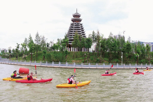 皮劃艇賽手經(jīng)過鼓樓。