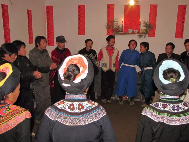 4、源自于搶婚習(xí)俗。以前,在彝區(qū)還有暴力阻攔或嘲弄接親人的習(xí)俗,這種習(xí)俗因搶婚相反,我們姑且稱之為攔婚習(xí)俗。何為攔婚?就是女方家就安排出嫁女素日的伙伴在接親隊(duì)來的路口守候著,當(dāng)接親隊(duì)來時(shí),抑或用水澆潑接親人,抑或抓粘草籽撒在接親人身上,甚至用蕁麻抽打接人,讓接親人很是吃消不下,既痛苦又尷尬。這種習(xí)俗可能源自于古時(shí)的搶婚制度。古時(shí),經(jīng)濟(jì)文化落后之時(shí),禮儀制度還不健全,存在著搶婚的現(xiàn)象,女子無法主宰自己的命運(yùn),被當(dāng)作財(cái)產(chǎn)和工具被男人搶奪。隨著禮儀制度的興起,女子的自我意識(shí)和維權(quán)意識(shí)有了增強(qiáng),她們內(nèi)心深處極力反對(duì)婚姻壓迫和搶奪,希望與男子取得平等的待遇。于是就開始出現(xiàn)了阻攔和戲弄接親人的習(xí)俗。阻攔和嘲弄接親人的方式多種多樣,也從最早的野蠻方式逐步向文明過渡。應(yīng)該說,阿買懇是攔婚習(xí)俗的延伸與發(fā)展,又折射出了搶婚的影子。阿買懇設(shè)置了幾十道盤歌的關(guān)卡,每道關(guān)卡都需要智慧和才藝,這是一種傳統(tǒng)習(xí)俗繼承中的文明發(fā)展表現(xiàn)?!鞍①I懇”的“懇”,除上面講的有“跳舞”、“歌舞”之意外,還有“搶”、“奪”之意。綜上所述,阿買懇蘊(yùn)含了搶婚制中深層次的文化心理積淀。