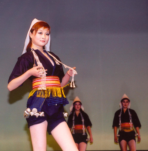 1. 葉車支系 。 葉車婦女的服飾很有特色。紅河縣葉車婦女一般頭戴白尖帽,上衣是靛青色對(duì)開(kāi)式短袖,無(wú)領(lǐng)無(wú)扣的土布衣,用寬寬的五色腰帶扎腰。布衣是一件一件地套著穿,少則七八件,多達(dá)十余件,里長(zhǎng)外短可以看出衣服的件數(shù)。下身穿黑色短褲,褲腳口打上適當(dāng)?shù)鸟藜y,褶紋數(shù)與上衣數(shù)大致相等,大腿以下全部裸露。