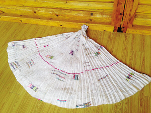 摩梭傳統(tǒng)手工百褶裙 阿七獨(dú)支瑪(參展人): 媽媽把許多古老的摩梭圖案編進(jìn)裙布里,并在裙布下方織一條不接頭的紅線,代表生命的輪回,這是摩梭人的一種人生觀。摩梭女性穿的裙子是百褶裙,媽媽編織好圖案及棉布衣后,還要再一個(gè)一個(gè)地縫上褶線,雖然很花工夫,但制作衣服的時(shí)候,是我見過的媽媽最開心的時(shí)候。