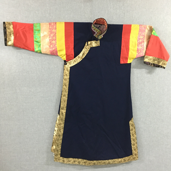 民族文化宮博物館收藏的這件立領(lǐng)右衽大襟五色袖“彩虹衣”,是土族女子盛裝時的一種服飾,征集于青海省互助土族自治縣。年代為20世紀30年代。“彩虹衣”長117厘米,胸圍120厘米,袖長59厘米,棉質(zhì)。整件女服右衽大襟,藍棉布襯里,左右側(cè)開衩,黑色“拉花”立領(lǐng),領(lǐng)上以土族傳統(tǒng)刺繡工藝—盤繡刺繡紅綠相間圓形圖案和辮形線條,綴三枚金色圓銅扣。衣袖為紅、黃、綠、白、粉五色彩布、彩緞拼接的“彩虹袖”,其中紅色為主色,占整個衣袖約一半面積,其余四色布塊相鄰,均勻分布于衣袖上方,布塊上刺繡有金色梅、蘭、竹、菊圖案。衣袖袖口鑲寬約3厘米黑色絲絨底刺繡花邊,花邊里外均繡有花草紋樣,做工精致。花邊上接寬約10厘米金色牡丹紋花邊,與襟邊、下擺、衩口等處所貼金色牡丹紋花邊相互呼應(yīng),極富設(shè)計感。