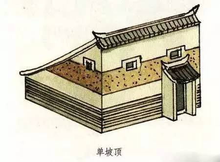 單坡頂就是只有一面坡的屋頂。它與我們常見的兩面坡屋頂有較大的不同,但從一面來看又有極大的相似性。我們甚至可以說,單坡屋頂就像是兩面坡屋頂被從中間一切兩半了。單片屋頂一般都用在不太重要的建筑或是附屬性的建筑上。在已發(fā)掘的商代宮殿遺址中,可以看到在商代即有單坡頂的廊子了。而現在的陜西、陜西等地的農村,許多民居仍然使用單坡式的屋頂,成為現今較富有特色的一種民居形式。