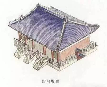 四阿殿頂也就是廡殿頂。四阿殿頂也是宋式叫法?!鞍ⅰ笔墙ㄖ蓓數那?,“四阿”就是四面坡式的曲檐屋頂。廡殿頂共有五條脊、四面坡,所以叫做四阿殿頂。