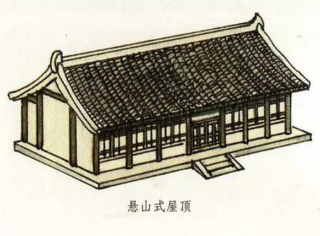 懸山式屋頂與硬山式屋頂一樣有一條正脊和四條垂脊。不過,它又有不同于硬山式屋頂那樣與山墻平齊,而是伸出山墻之外。這部分伸出山墻之外的屋頂是由下面伸出的桁(檁)承托的。所以懸山式屋頂不僅有前后出檐,在兩側山墻上也有出檐。懸山式是兩面坡屋頂的早期做法,不過中國古代的重要建筑基本沒有使用懸山式屋頂的,特別是唐代以前尤為少見。