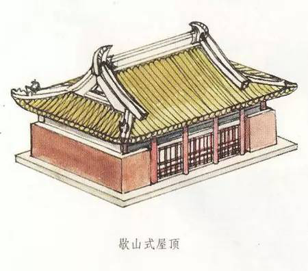 歇山是清式叫法,在清代之前它又有曹殿、漢殿、廈兩頭造等不同名稱。歇山式屋頂在具體形式上又有最基本形式的單檐歇山頂,以及變化形式的二層、三層或多層屋頂的重檐歇山頂,還有最上面的屋頂可以不設正脊而形成卷棚式的卷棚式歇山頂等多種形式。