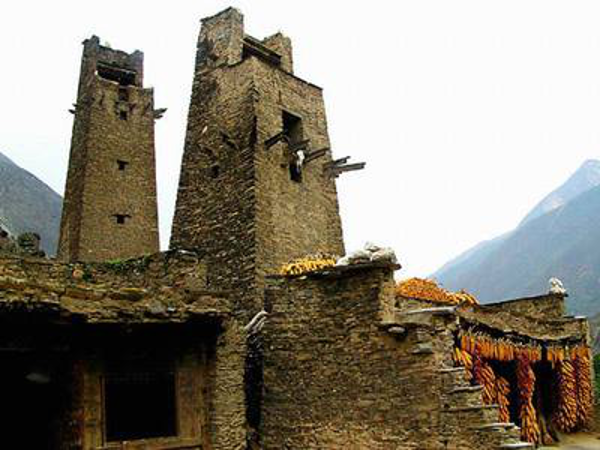 在羌語(yǔ)中,碉樓被稱(chēng)為“邛籠”,意為美麗、高貴的房子,早在2000年前《后漢書(shū)·西南夷傳》就有羌族人“依山居止,壘石為屋,高者至十余丈”的記載。碉樓的高度在十米至三十米之間,用于御敵、貯存糧食和柴草。碉樓有四角、六角、八角幾形式,有的高達(dá)十三四層。建筑材料是石片和黃泥土,墻基深1.35米,以石片砌成。石墻內(nèi)側(cè)與地面垂直,外側(cè)由下而上向內(nèi)稍?xún)A斜。修建時(shí)不繪圖、吊線(xiàn)、柱架支撐,全憑高超的技藝與經(jīng)驗(yàn)。建筑穩(wěn)固牢靠,經(jīng)久不衰。自唐朝來(lái),羌族人民因各種原因向西北遷移,到了西藏和青海,所以現(xiàn)在,羌族碉樓也往往被稱(chēng)為藏族碉樓。
