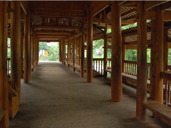 瑤族風雨橋,基本上都是跨河而建,主要由三部分組成:分別是下部的墩臺,中部的跨河游廊,上部的廊亭和閣樓。底層的石作與主體木作搭配結(jié)合。從風雨橋本身功能來說,廊橋頂面的舍瓦屋面,有利于排水。通透而寬敞的廊橋,適合采光、通風和遮雨。同時,石作橋墩堅固耐用,以鄉(xiāng)土水杉作為橋身主材,在群山環(huán)繞、濕熱多雨的亞熱帶氣候中,能夠屹立400余年,至今依然保持其使用功能。