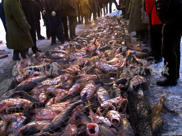 隨著“魚把頭”高亢的號(hào)子,馬拉人拽,一張幾千米長(zhǎng)的大網(wǎng),被緩緩地拉出冰面。鯉魚、鯽魚、鰱魚、鯰魚等各種魚類一群一群翻上了冰眼。轉(zhuǎn)眼之間,冰面上堆起了一個(gè)個(gè)魚垛。