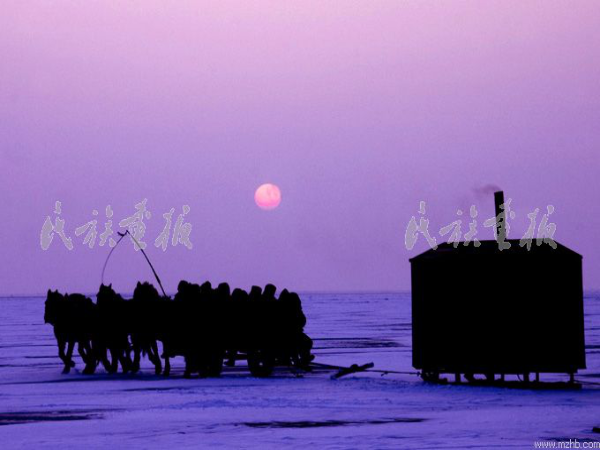 第二天,天剛放亮,我們就來(lái)到了湖邊。借著月光,看見(jiàn)遠(yuǎn)處冰面上出現(xiàn)了三套馬車。馬車上坐滿身穿棉大衣、頭戴狗皮帽的漁工?!棒~把頭”老石招呼我們上車后,車夫隨即揚(yáng)鞭催馬,我們頂著寒風(fēng)駛進(jìn)查干湖。