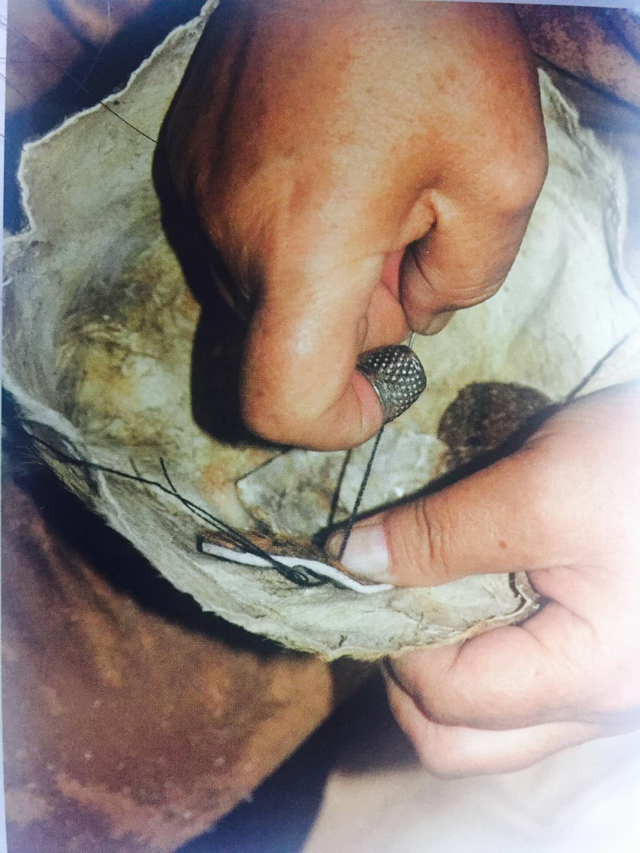 狍角帽是用整狍子的頭顱,去掉骨肉后,保留狍頭上的毛、角、耳朵、鼻子和口,精心鞣制而成。主要制作流程是:剝皮,清洗、熟皮,定型,補眼睛、刺繡、制作繡片,縫合護耳與頭皮,制作里襯。制作時,如何剝得完整的頭皮,是整個制作環(huán)節(jié)的關鍵。