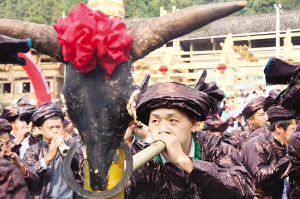 在藝術(shù)節(jié)上,“二千九”蘆笙笛大賽、侗族大歌比賽、侗戲比賽等一系列民族文化活動(dòng)為重陽(yáng)節(jié)增添了喜慶。據(jù)了解,“二千九”泛指在清朝時(shí)期按侗款條約制定的2900戶人家的所在地,是侗族聚居地。這里以侗族大歌為代表的民族民間文化藝術(shù)蜚聲海內(nèi)外。圖為當(dāng)?shù)厝罕姶底嗵J笙笛。