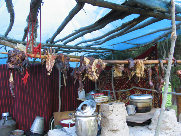 哈薩克民族以游牧為生,其主要的生產(chǎn)方式是畜牧業(yè),所以哈薩克族的飲食文化也與其生產(chǎn)方式息息相關(guān)。哈薩克族物質(zhì)生活與精神生活的方方面面都透露著畜牧業(yè)和草原游牧生活的濃郁氣息,例如大多數(shù)的哈薩克民族飲食都與畜產(chǎn)品肉、奶制品有關(guān)。牛、馬、綿羊(山羊)、駱駝等家畜的肉和奶是哈薩克民族飲食的主要原料。日常生活中他們的主要飲料是奶、“柯莫孜”(馬奶子)、“舒巴特”(駱駝奶)等。還有用乳汁為原料制作而成的酸奶疙瘩、奶酪、“蘇孜別”“葉吉蓋”“杰尼特”等食物非常美味。也就是說,以畜牧業(yè)為主的生產(chǎn)方式影響著哈薩克族人民生活的方方面面。奶類和肉類是日常生活的主要食物,面食是次要的食物,哈薩克族很少吃蔬菜。肉食主要有綿羊肉、山羊肉、牛肉、馬肉、駱駝肉,除此之外,還有野獸肉和野禽肉也是人們補充的肉食,其做法主要有煮、熏、烤三種。