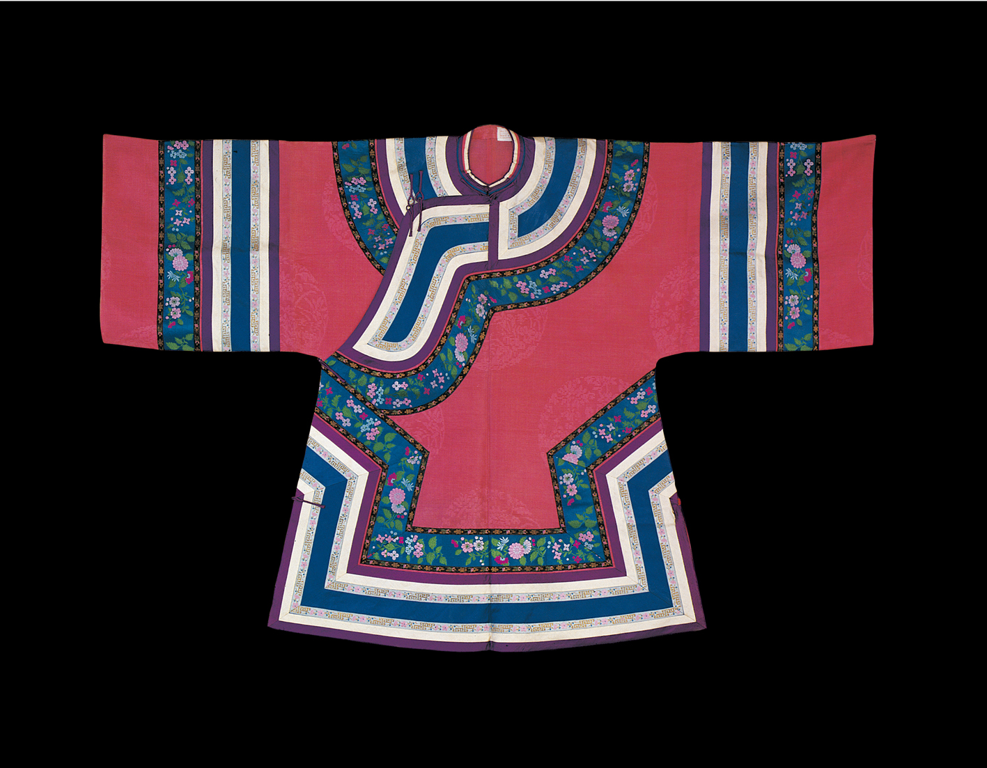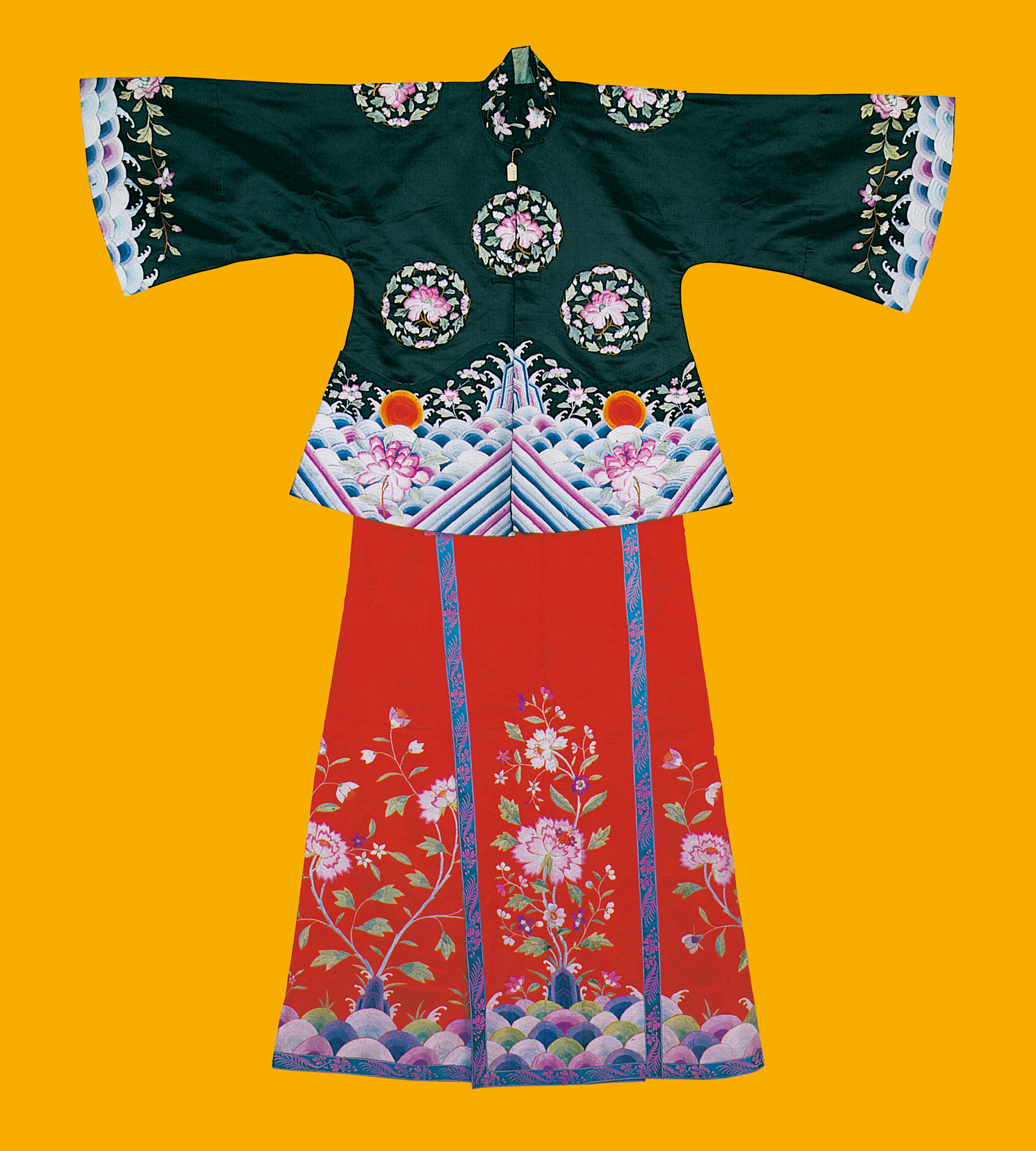 元代,作為民族大融合和中外文化大交流時(shí)期,長衣統(tǒng)稱為袍,其樣式南北方差異不大,但材料貴賤精粗,卻差距懸殊。漢族男性發(fā)式變化不多,但北方的漢族女性發(fā)式較前簡化。在元朝并沒有完整的冠服制度。蒙古人入主中原后仍保持其生活習(xí)俗,但同時(shí)又受漢族的影響,服飾日趨華麗。在大宴活動(dòng)中,天子百官要穿統(tǒng)一顏色的服裝,稱為“質(zhì)孫服”,其形為袍襖狀,與漢族深衣相近(圖為漢族清代牡丹紋緞繡女裝,中央民族大學(xué)民族博物館館藏)。