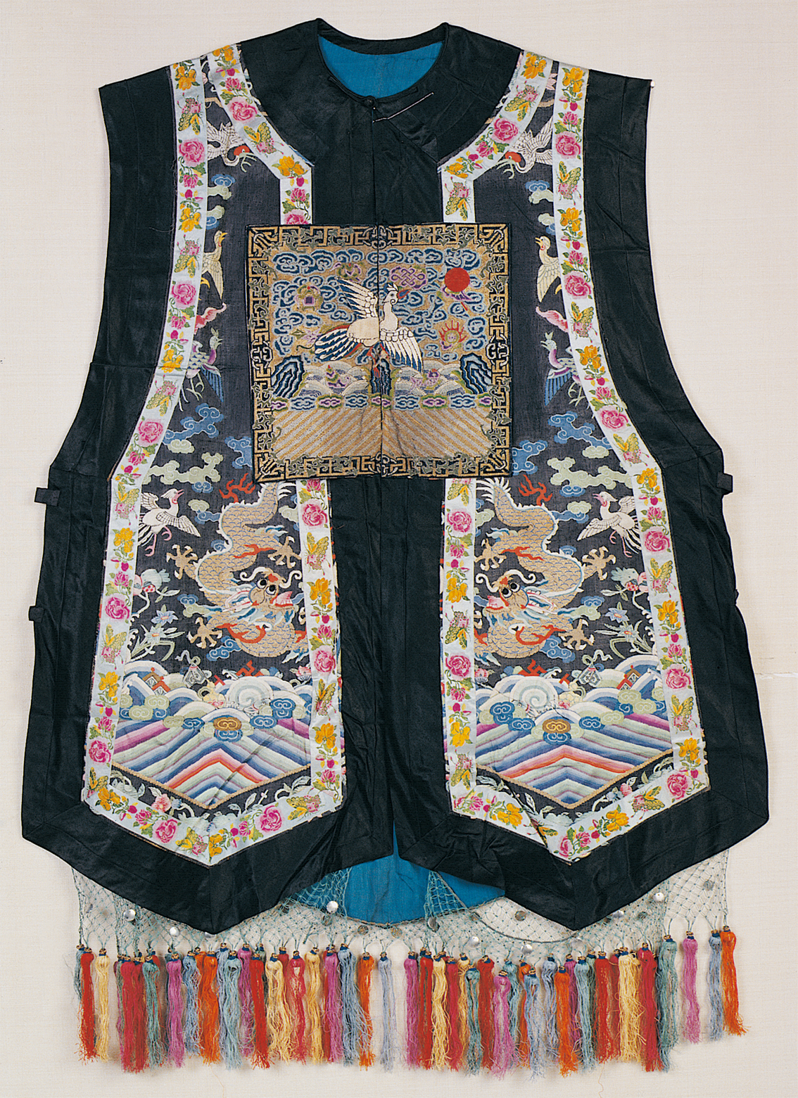 《史記·五帝本紀(jì)》載:“黃帝之前,未有衣裳屋宇。及黃帝造屋宇,制衣服,營殯葬,萬民故免存亡之難?!痹谖迩Ф嗄昵暗男率鲿r(shí)代仰韶文化時(shí)期,可能就產(chǎn)生了原始的農(nóng)業(yè)和紡織業(yè),開始用織成的麻布來做衣服。據(jù)傳,黃帝之妻嫘祖發(fā)明了飼蠶和絲紡,衣冠服飾基本成制。殷商西周,冠服制度逐漸完善,春秋戰(zhàn)國時(shí)期,衣冠款式走向多元,冠服制被納入“禮治”范疇,從此漢族衣冠服制更加詳備。中原地區(qū)還出現(xiàn)了胡服戎裝,甚至相沿成風(fēng)(圖為漢族清代七品文官女朝褂,中央民族大學(xué)民族博物館館藏)。