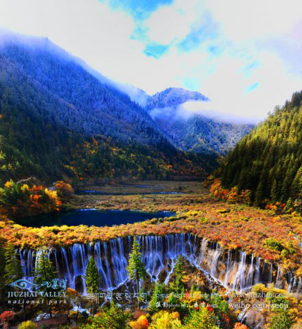九寨溝四周群山聳峙,有雪峰數(shù)十座,高插云霄,終年白雪皚皚。河谷地帶奇水薈萃,其間有成梯形分布的大小湖泊114個(gè),瀑布群17個(gè),鈣華灘流5處,泉水47眼,湍流11段,以1870米的海撥高差,在12 座雪峰之間穿林跨谷,珠連玉接,呈Y字型串珠,逶迤近60公里,形成了中國唯一、世界罕見的以高山湖泊群和瀑布群以及鈣華灘流為主體的風(fēng)景名勝區(qū)。湖泊小者數(shù)平方米,最大的長海長達(dá)7公里。湖水終年碧藍(lán)澄澈,色彩斑讕,在陽光照射下,呈現(xiàn)出藍(lán)、黃、橙、綠等多種色彩,絢麗奪目。天氣晴朗時(shí),藍(lán)天、白云、雪山、森林倒映湖中,水光浮翠,美麗如畫,并隨季節(jié)推移呈現(xiàn)出不同的色彩和風(fēng)韻,有“九寨歸來不看水”之說。