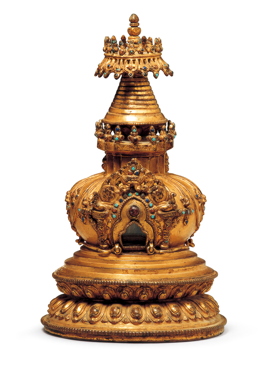青海一些牧區(qū),天葬日凌晨,死者最小的兒子將尸體抱出帳蓬,人們把已經捆好的尸體和一個裝滿土石的口袋連接起來搭在牛背上,或由天葬師背尸體到火葬場,送葬者不能回頭、不能喧嘩、不能停步。到天葬臺后,除留一個非親屬的老人外,其余人全部撤離,然后天葬師將尸體肢解喂禿鷲。如果禿鷲將碎尸吃干凈,意味著死者生前行善積德,其靈魂已升天,如果禿鷲沒吃干凈,說明死者生前有罪孽,家人要給寺院布施,請求寺院僧人再做法事,以贖死者罪惡,讓靈魂早日升天(圖為鎏金紫銅舍得塔)。