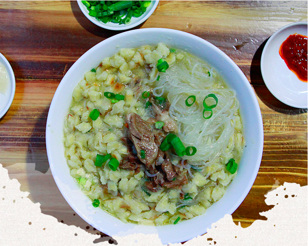 饃掰好后,請(qǐng)伙計(jì)呈給掌勺大廚,加羊肉湯大火快煮,加牛羊肉、粉絲、蔥花、蒜苗、香菜,優(yōu)質(zhì)的還有木耳、黃花菜和香干等即可端上來吃了。這樣一大碗自己親手掰好的泡饃,翠綠的蔥花、蒜苗、香菜、紅褐色的牛羊肉、黃色的金針菜、映襯著潔白晶瑩的粉絲、黝黑的木耳、香味四溢,。還應(yīng)注意的是:端上來的泡饃應(yīng)是泡饃墊底,粉絲覆成網(wǎng)形,佐以蔥花、香菜、牛羊肉擺成魚形在最上面,吃時(shí)左手拿勺,右手執(zhí)筷。泡饃上桌后,把辣子醬鋪在上面,切忌攪動(dòng),講究從一邊“蠶食”,以保持鮮味。糖蒜用否,個(gè)人自愿。餐后飲用一小碗原汁烹制而成的高湯,以為清口。