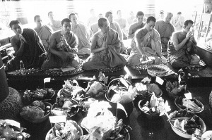 早晨8點(diǎn)多鐘,隨著緬寺大佛爺都比罕念誦起那古老的滴水詞經(jīng),賧奉儀式開(kāi)始了。我隨玉波一家坐在從家里帶來(lái)的涼席上。緬寺里已擺放不下人們送來(lái)賧奉的物品,只好放在緬寺的周?chē)?。人們用一根白線(xiàn)拴系著物品連著緬寺,以示并沒(méi)有遠(yuǎn)離緬寺和佛祖。