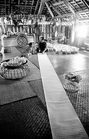 這時(shí),走來(lái)一個(gè)大佛爺和兩個(gè)老人,因?yàn)榉鹱娌粫?huì)開(kāi)口說(shuō)話(huà),他們是來(lái)替佛祖給玉波念“薩拉帥”祝詞的。先由大佛爺念了一段《祝福經(jīng)》,給玉波滴了水,然后兩個(gè)老人打開(kāi)玉波那寬半尺、長(zhǎng)足有7米多的“薩拉帥”祝詞。玉金說(shuō),這祝詞是請(qǐng)曼降村的前大佛爺康朗寫(xiě)的(康朗:指佛爺還俗的人)。來(lái)倆個(gè)老人念,是考慮到可以換著念。玉波的奶奶也想到了玉波可能跪不習(xí)慣,就帶來(lái)了墊子,讓玉波或跪或坐,因?yàn)槟钔曜T~要兩三個(gè)小時(shí)。祝詞的內(nèi)容大致是這樣的:“我是一個(gè)在菩提樹(shù)下長(zhǎng)大的女孩,在佛祖的護(hù)蔭下,臉長(zhǎng)得像菩提樹(shù)葉一樣又嫩又青,身材像檳榔樹(shù)一樣苗條好看,心像金鹿一樣善良。當(dāng)我年滿(mǎn)12歲以后,人世間的喜樂(lè)情愛(ài),貧窮苦難就會(huì)來(lái)到我的面前。今天在父母的幫助下,我準(zhǔn)備了這些物品來(lái)賧給佛祖。我千祈禱萬(wàn)祈求,希望佛祖保佑我織布是行家,丈夫種田是能手。命里見(jiàn)火能親,遇水能溶。生的孩子女的長(zhǎng)得像一只蜜蜂,男的長(zhǎng)得像一頭水牛,用他們的勤勞贍養(yǎng)雙親。從小就聽(tīng)話(huà),自幼就很乖。在母親的懷里不亂哭,在父親的背上不亂搓……”