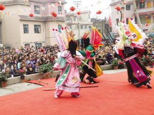 與屯堡地戲一樣,大寨布依地戲劇目的內(nèi)容大多取材于歷史演義和民間傳說中金戈鐵馬的英雄故事。與屯堡地戲相比,大寨布依地戲表演者身上沒有了屯堡地戲里那充滿尚武之氣的盔甲戰(zhàn)袍,取而代之的卻是具有布依風(fēng)格的藍(lán)衫長褂,桃花裝飾,古樸中透出優(yōu)美。劇中的女角都是男扮女裝,粗獷、豪邁的精彩打斗中,不時(shí)有輕柔的表演成分。整臺表演斗中有舞,以唱代言。唱段短小精悍,與屯堡地戲相比更多了舞臺的戲劇觀賞效果。