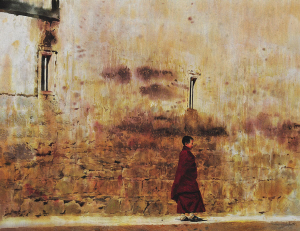 在麗江的束河古鎮(zhèn),他坐在小溪邊,吹著清涼的微風,聽著對面咖啡屋傳來的低吟慢唱,心情舒暢地畫著自己的畫。很快,一幅《水邊咖啡屋》就在這不經(jīng)意間誕生了。在梅里雪山,早晚都能看到人們所說的日照金山的美景,打開窗戶,暖陽透進來照在身上,就這樣畫著藏族人心中的神山,他覺得實在找不出還有比那一刻更美好的感覺了。