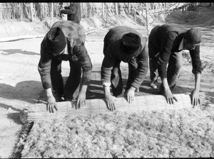 這時(shí),亞生已經(jīng)開始了第二步,他把彈好的羊毛鋪勻,開始噴灑開水。只見(jiàn)他熟練地把水噴向羊毛,然后和妻子一起快速把簾子卷好,用羊毛繩綁緊,再用腳踏著卷好的簾子在平地上來(lái)回踏蹬,這樣不停地重復(fù)后,做成了氈坯。亞生停下來(lái)解開簾子,拉平氈坯,修整好邊角,又灑上熱開水,把氈坯卷起,這是工藝最關(guān)鍵也是最后一步——他們一起跪在簾上,用雙臂反復(fù)搓滾氈坯,感覺(jué)已經(jīng)平整了,夫婦倆又齊心協(xié)力把氈坯展開拉平,放到院子里。此時(shí),亞生長(zhǎng)出了一口氣,抹抹頭上的汗說(shuō):“晾干了就可以賣了!”