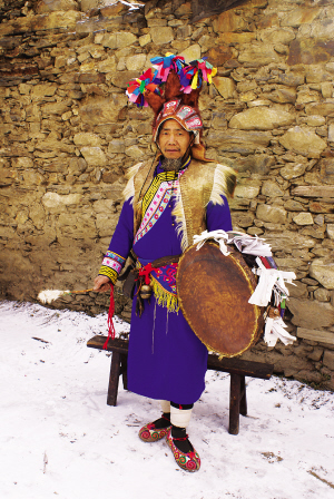 “釋比”是羌族對宗教儀式執(zhí)行者的尊稱,漢語稱之為“端公”,是羌族文化知識的集大成者。釋比頭戴的猴皮帽和手中的羊皮鼓現(xiàn)在已成為珍貴的民族文物