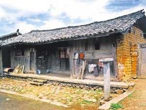 廚房大都在左間,地中間橫砌土臺鍋灶,上面是兩口大鐵鍋??亢髩κ谴毒?、餐具,前面是石碓,平時(shí)搗豬飼料,節(jié)日搗粑粑,用石碓搗的辣椒面也格外好吃。右間大都是家長的居室,只放木床。兩側(cè)廂房與主房分離,木板梯上下。一側(cè)下層是豬圈、牛欄,上邊存干草;另一側(cè)下面堆放糧食、燒柴、摩托車,上層是未婚子女的臥室,有廊道、腰欄。院落小的,在主房對面設(shè)牛欄,砌土坯墻圍成獨(dú)立的合院。