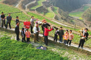 不一會(huì)兒,浩浩蕩蕩的娶親隊(duì)伍沿著田埂走過來了??匆娐愤厰[放的東西,他們就在衣服上面留下了糯米飯、雞肉之類的食物。