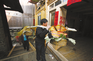 新娘離開娘家時(shí),女方不僅要送單數(shù)的雞、鴨,如5、7、9只,就連給男方所挑的陪嫁品擔(dān)子也必須是單數(shù)的。