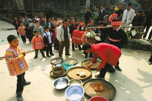我們尾隨著娶親隊(duì)伍進(jìn)寨,發(fā)現(xiàn)寨子中間的路上也擺著很多簸箕、臉盆之類的容器,原來,村民們也要“討賞”呢!聽高邦寨的村支書說,遇到這種情況,路人放的東西越貴重,娶親隊(duì)伍留下的肉食就越豐盛,有時(shí)甚至?xí)畔乱徽浑u或鴨呢!