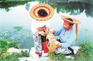 亮麗的頭巾,是用一兩百米長(zhǎng)的彩色花帶,一圈圈地往頭上悉心地盤纏,狀若葵花。頭巾隨著姑娘們俊美的身影晃動(dòng)在山野,宛若束束火樣的山花。盤頭巾的彩色花帶是靠姑娘們靈巧的雙手用紅黃兩色毛線編織而成。哪曾知道,盤個(gè)講究點(diǎn)的頭巾,除了從小就要不斷研習(xí),每天還得花上半個(gè)小時(shí)。耐看,但太過(guò)麻煩。近年來(lái),瑤山的生活節(jié)奏也在加快,聰明的奉雪妹就別出心裁,幾經(jīng)實(shí)驗(yàn)改進(jìn),用竹篾條編成一個(gè)斗笠般的錐臺(tái)形骨架,再把花帶依次編滿骨架的上下兩面,就成了形似斗笠的花頭巾。出門往頭上一戴,與原有風(fēng)格相近,卻更顯風(fēng)韻,也更方便。這也是花瑤妹子對(duì)代代相承的傳統(tǒng)服飾文化的一次大膽改革。